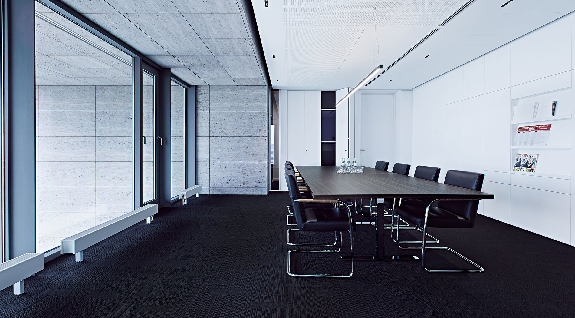 The light-colored natural stone frame of the external facade penetrates the conference room and naturally becomes part of the ceiling design. Retrofitted ceiling panels handle lighting, ventilation and acoustical treatment. This room, with its view of the media harbor and glazing on the facade side, is complemented by a custom designed sideboard and the large walnut conference table.