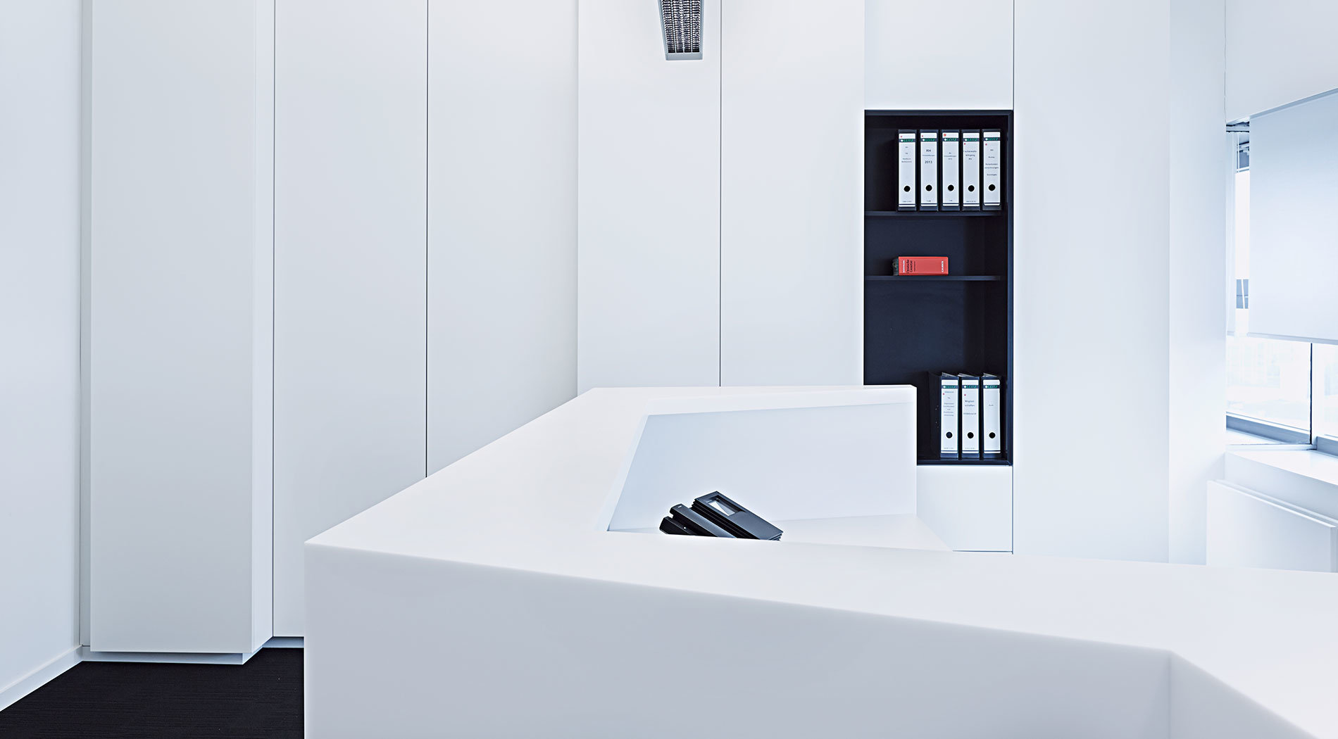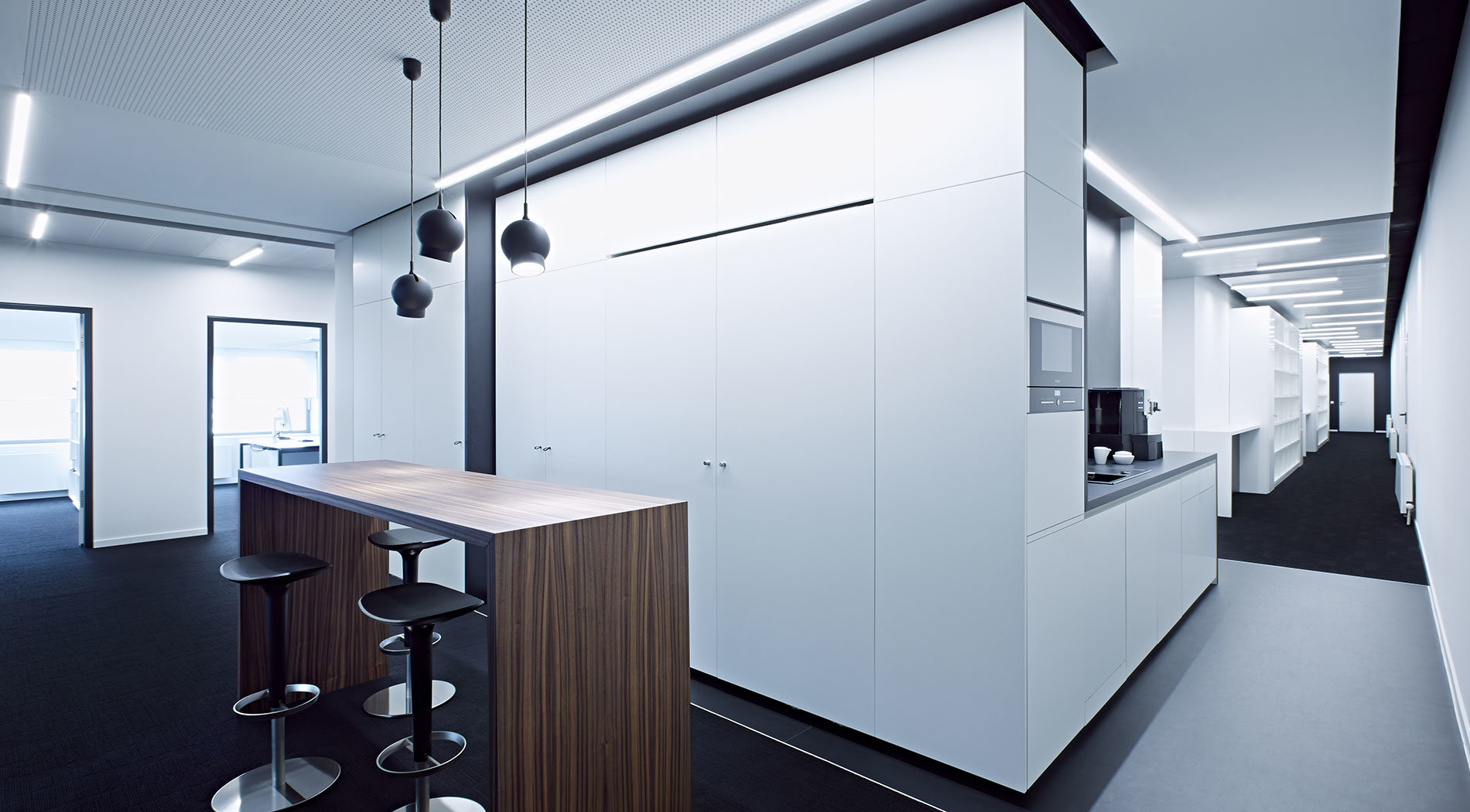 In der Außenzone der Bürofläche sind die acht Einzelbüros und das Doppelsekretariat, der Empfang mit dem Wartebereich sowie der große Konferenzraum angeordnet. Der innen liegende Flur mit der umlaufenden weißen Wandverkleidung nimmt die Nebenbereiche auf und formt die Bibliothek, das Archiv, die Teeküche und den Aufenthaltsbereich. Der Konferenzraum wird bei geöffneten Türen Teil des Flurlaufs.