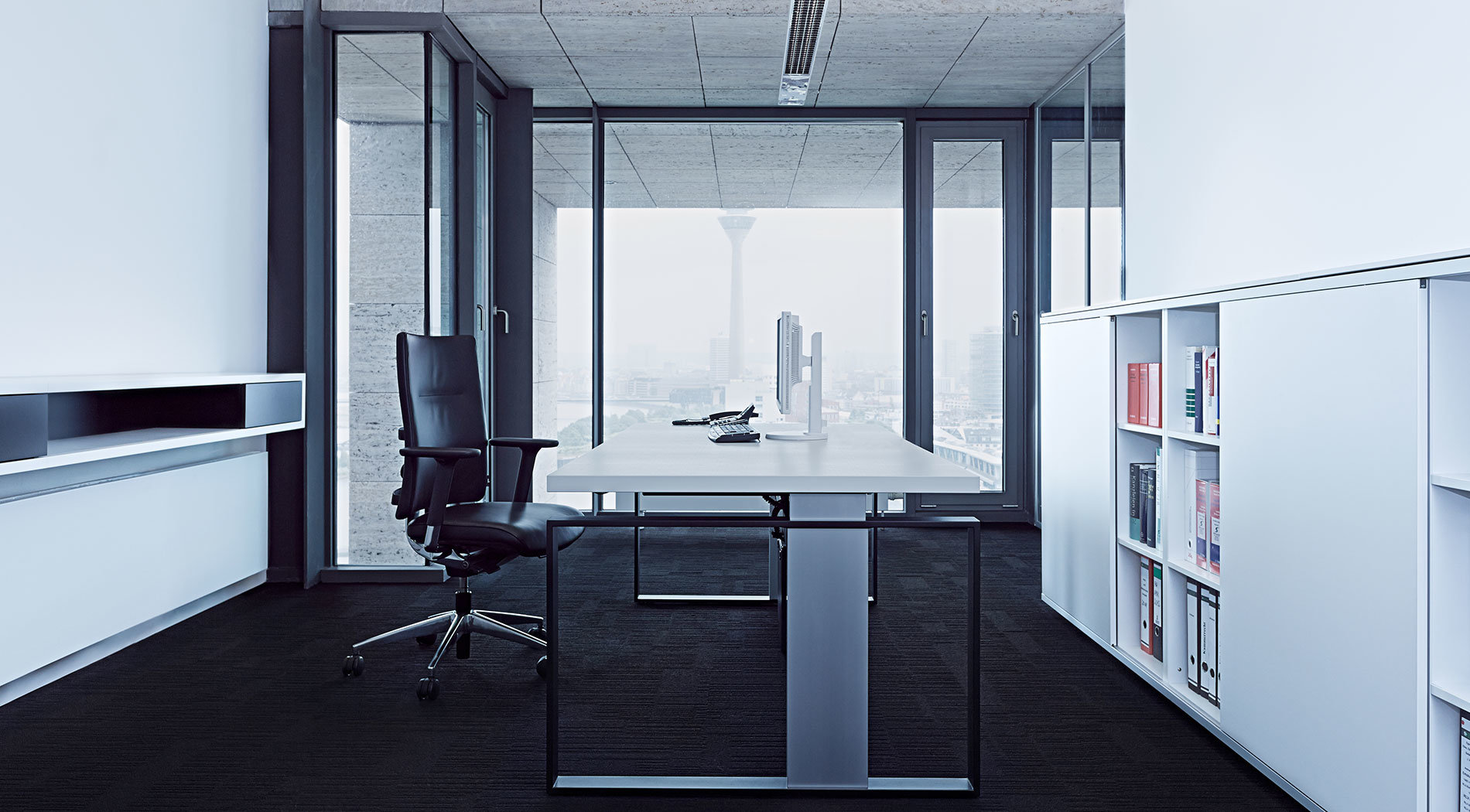 The Düsseldorf branch of the renowned law firm of Dierks+Bohle.is located on the Rhine harbor basin within walking distance of the old town. The law offices are distributed over the entire 16th floor of DOCK 2, a 17 story office building with a distinctive facade by Dutch architect Jo Coenen. The high rise with the natural stone yoke and horizontal window pattern was completed in 2002 and is part of an urban development concept designed as a closure for the basin and counterpart to the television tower situated to the north. The view from the top floor extends across the Rhine, the City of Düsseldorf and the Rhineland as far as the Bergisches Land region.
