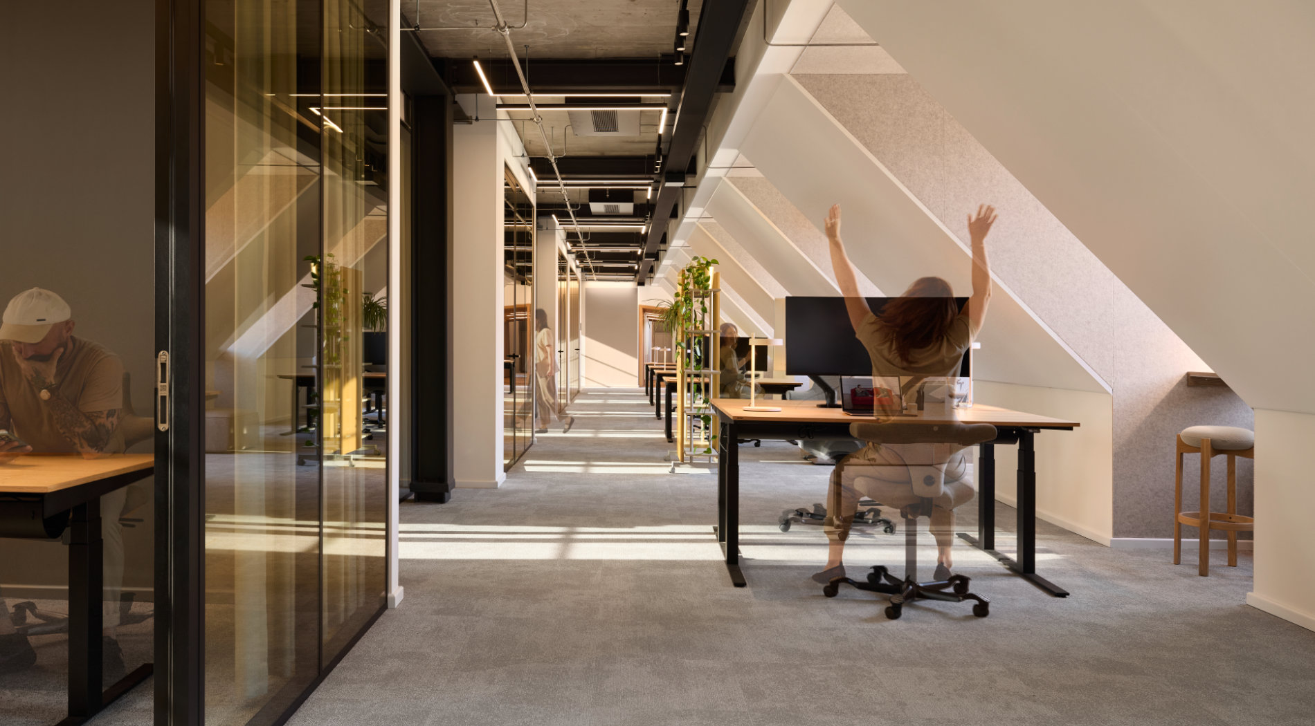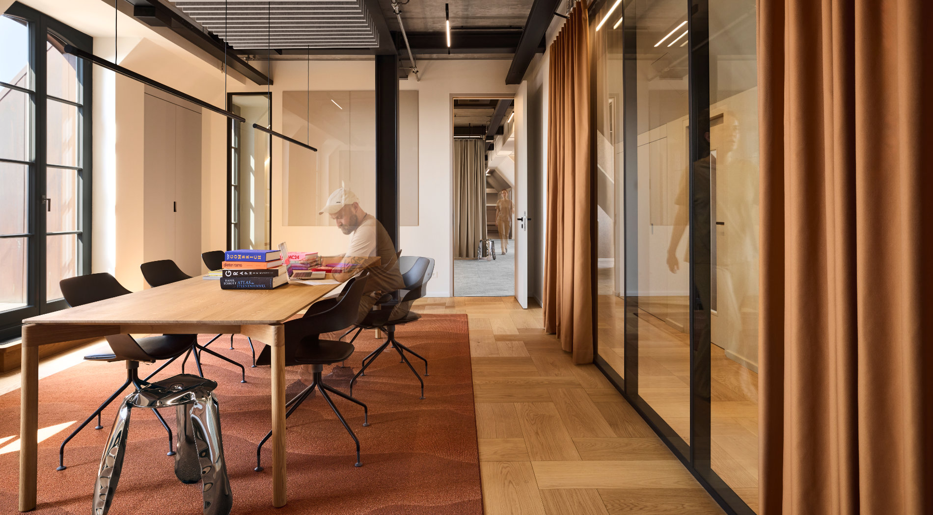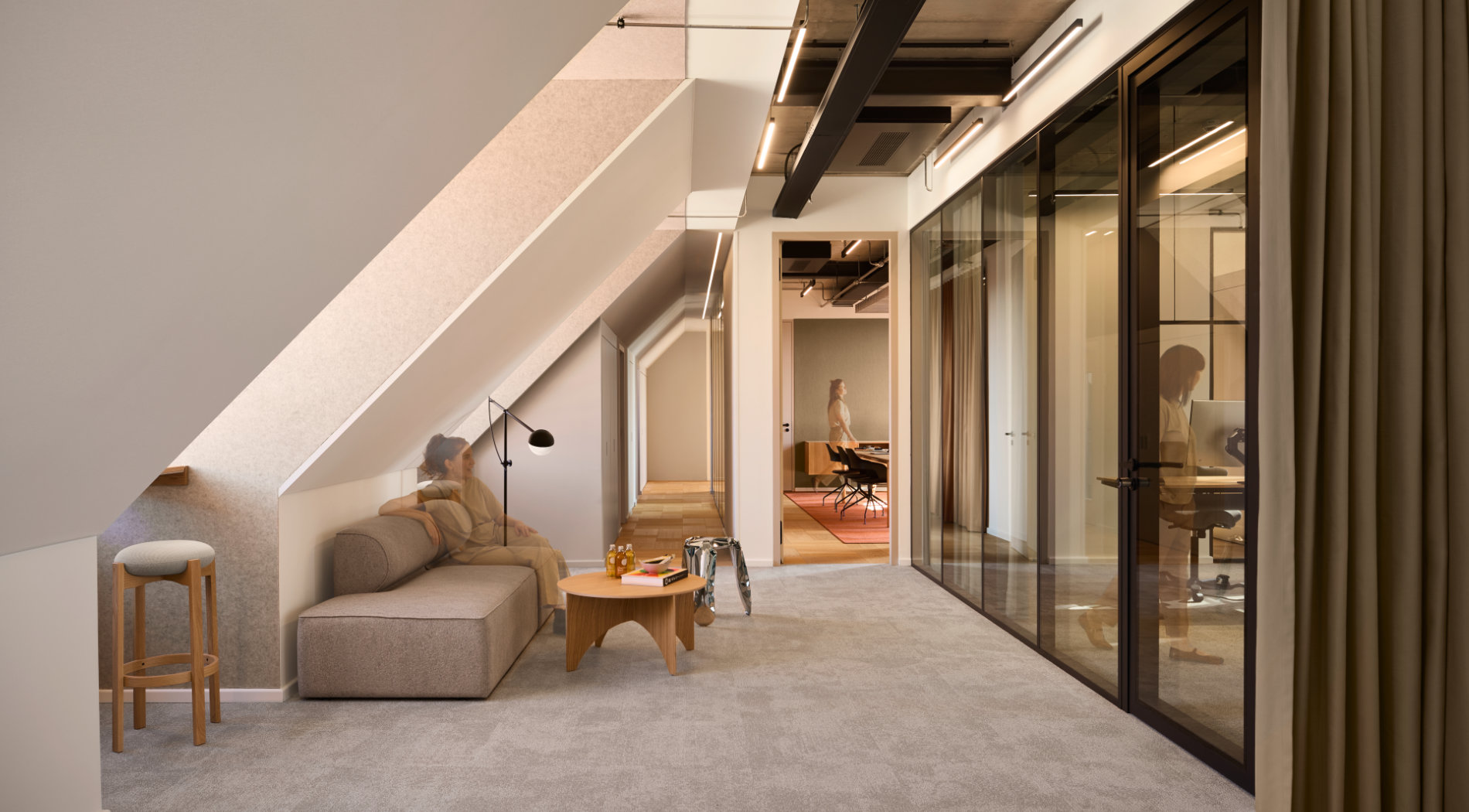 In der Mitte Berlins, wo Vergangenheit und Gegenwart aufeinandertreffen, wurde im neu ausgebauten Dachgeschoss eines historischen Telegraphenamts ein einzigartiger Arbeitsraum geschaffen, der Architektur als Netzwerk von Beziehungen begreift. Der Ausbau transformiert die besondere Topografie des Dachraums – mit seinen markanten Dachschrägen, Gauben und Loggien – zu einer räumlichen Choreografie, die den Dialog mit der Stadt sucht.