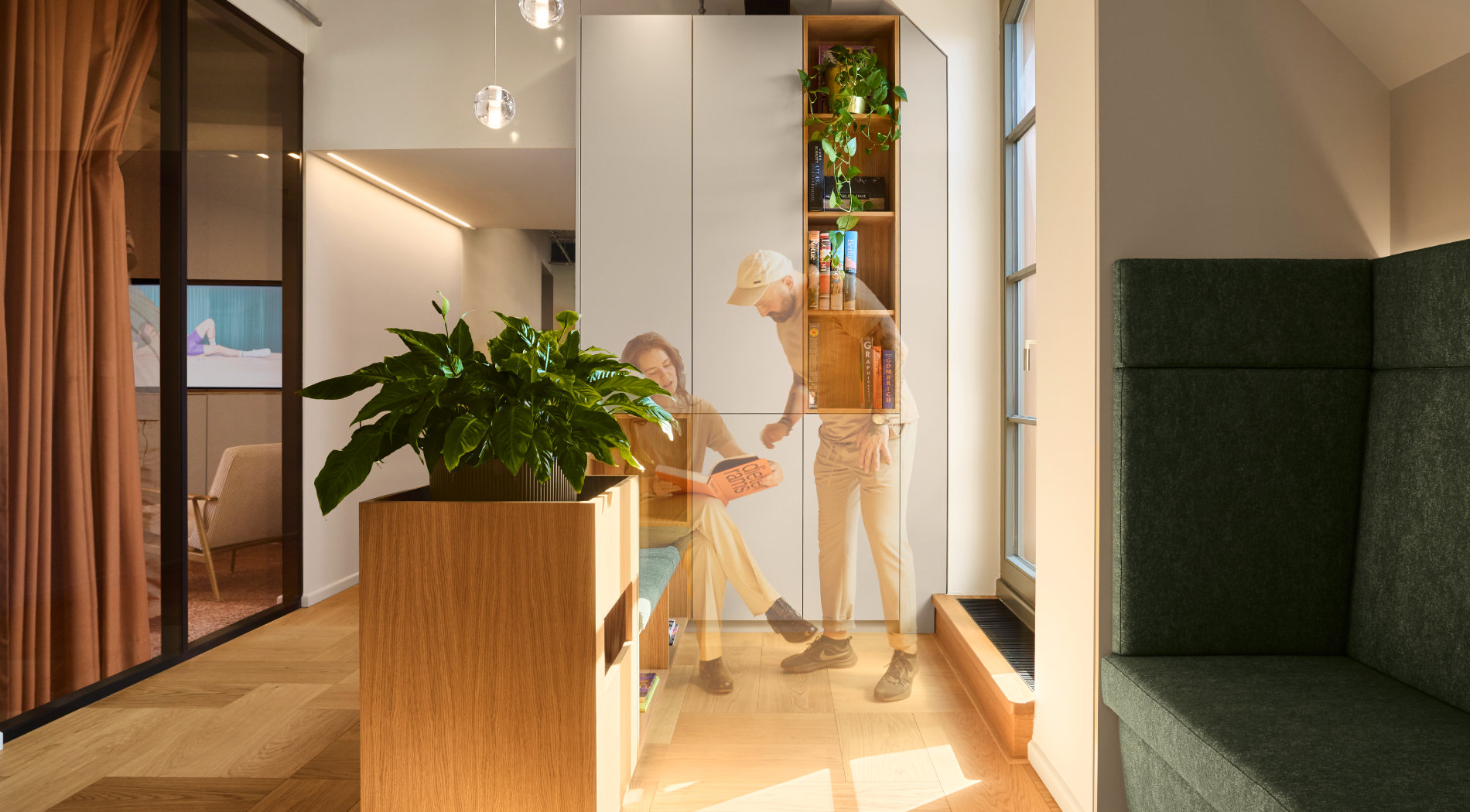 Die räumliche Dramaturgie entfaltet sich nicht hierarchisch, sondern dialogisch – sie steigert sich mit ihren Nutzer:innen, statt sie zu überformen. Das Bürokonzept antwortet auf die Bedürfnisse der Arbeitswelt von morgen, ist differenziert, dynamisch, beziehungsfähig. Die Räume folgen einer sozialen Logik nach dörflichem Vorbild – mit öffentlichen Plätzen, kommunikativen Wegen und privaten Rückzugsorten. Unterschiedliche räumliche Dichten erzeugen eine fein abgestimmte Dramaturgie aus Offenheit und Intimität: für Co-Kreation oder Konzentration, Gespräch oder Stille, für Begegnung oder Bewegung.