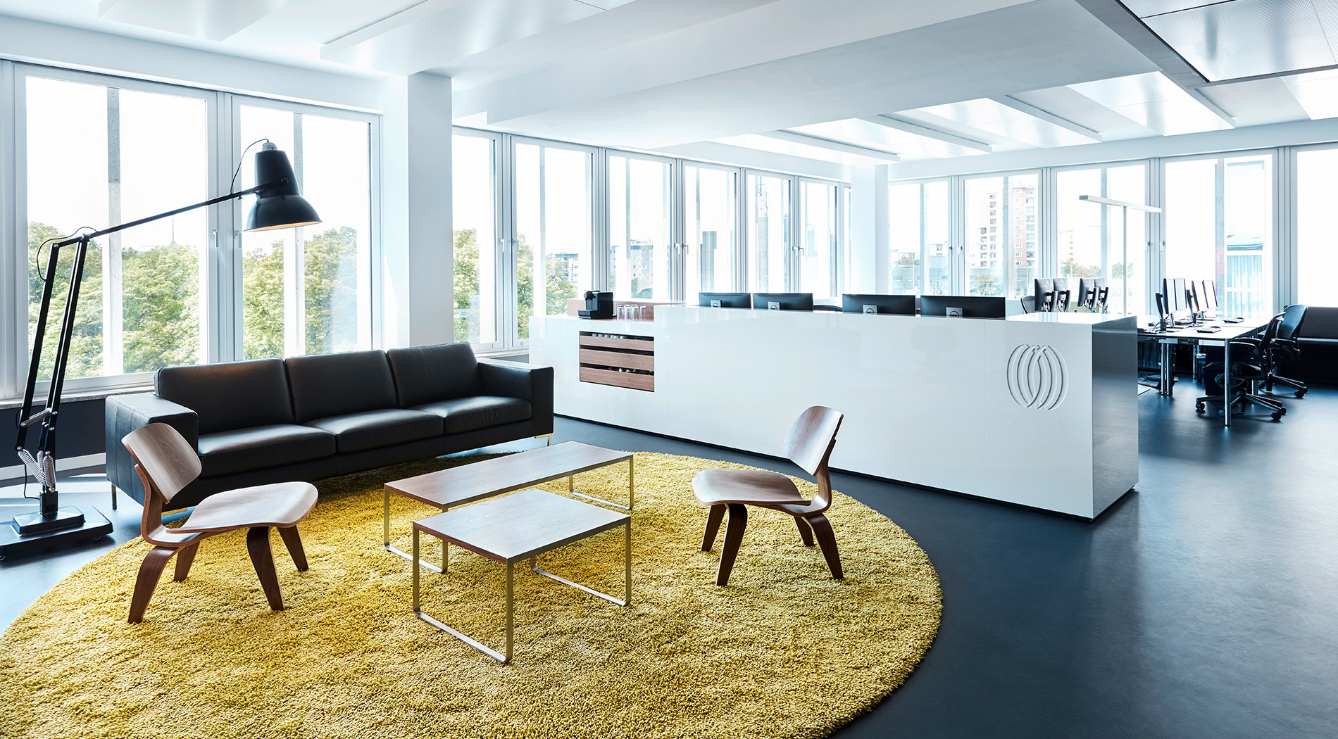 Ziel war es, eine kommunikationsfördernde Struktur für die rund 100 Mitarbeiter des Unternehmens zu schaffen. Die Bürofläche ist unterteilt in den Empfangsbereich mit angegliedertem Konferenzraum und einer Flex-Arbeitszone sowie drei Open Spaces. Ein speziell entwickeltes höhenverstellbares Tischsystem mit Andockmöglichkeiten für weitere Tischelemente unterstützt hier die Teambildung.