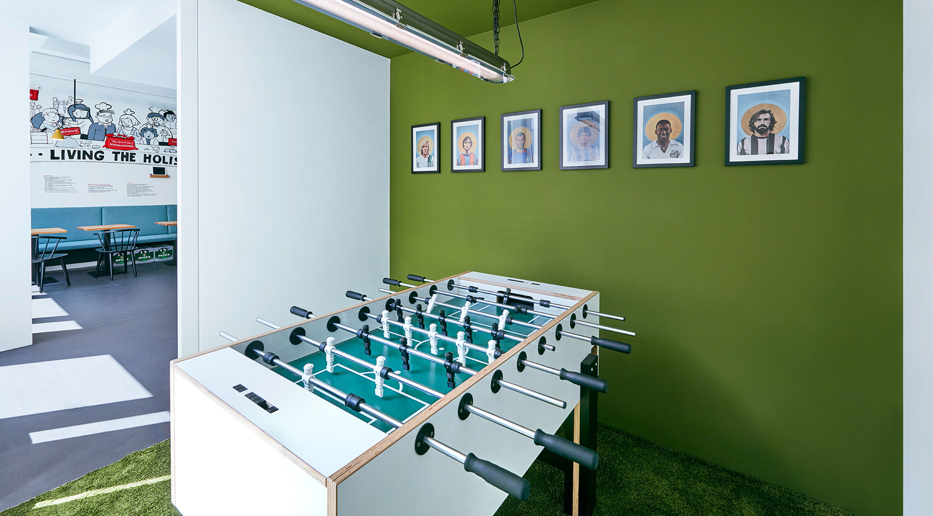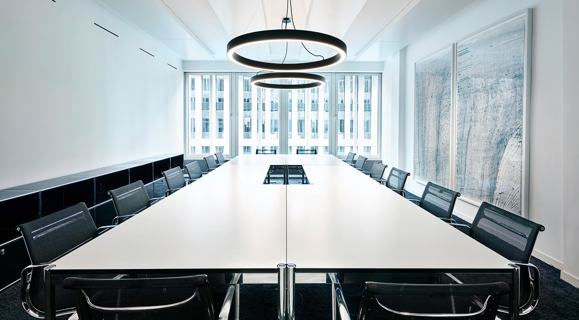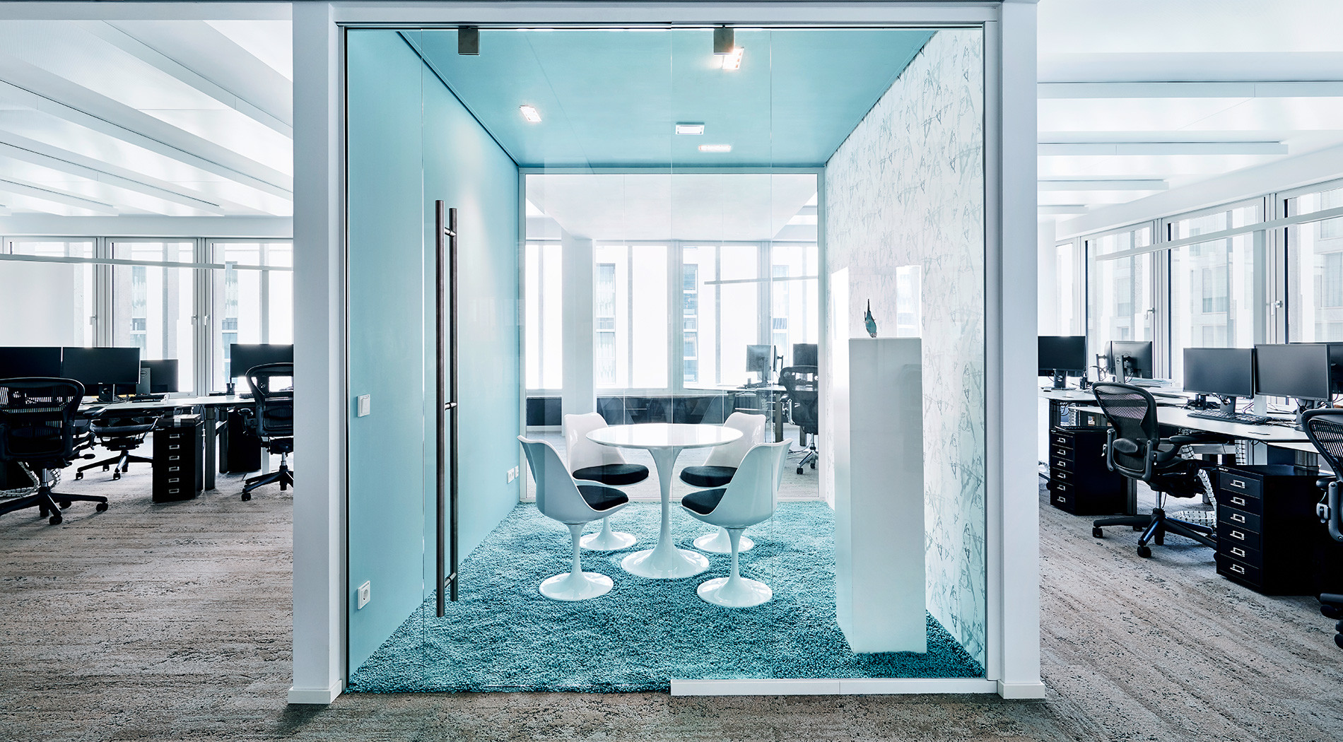 Highlight auf der Fläche ist ein eigens für ein Kunstwerk aus der Privatsammlung des Bauherrn entworfener Raum. Für ‚Hansi goes down’ von Via Lewandowsky entstand eine gläserne Meetingbox, die sich gestalterisch an das Kunstwerk anlehnt.