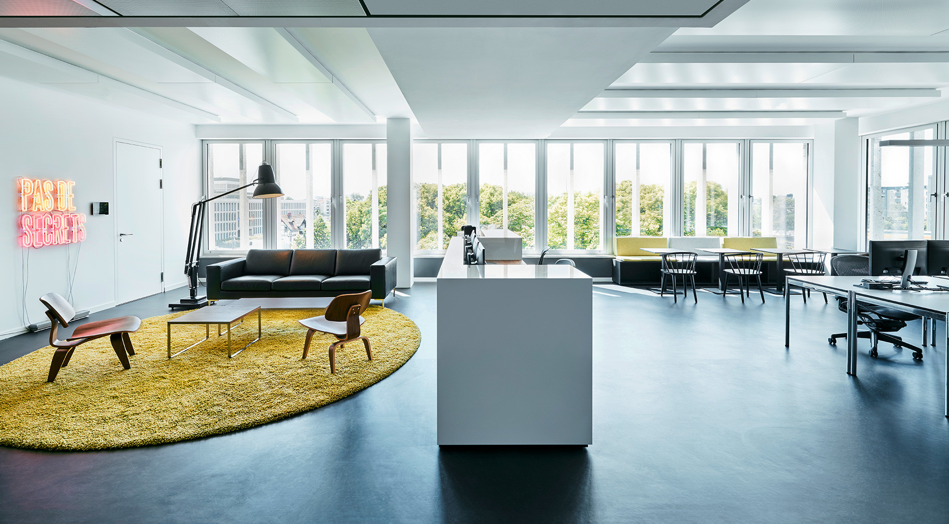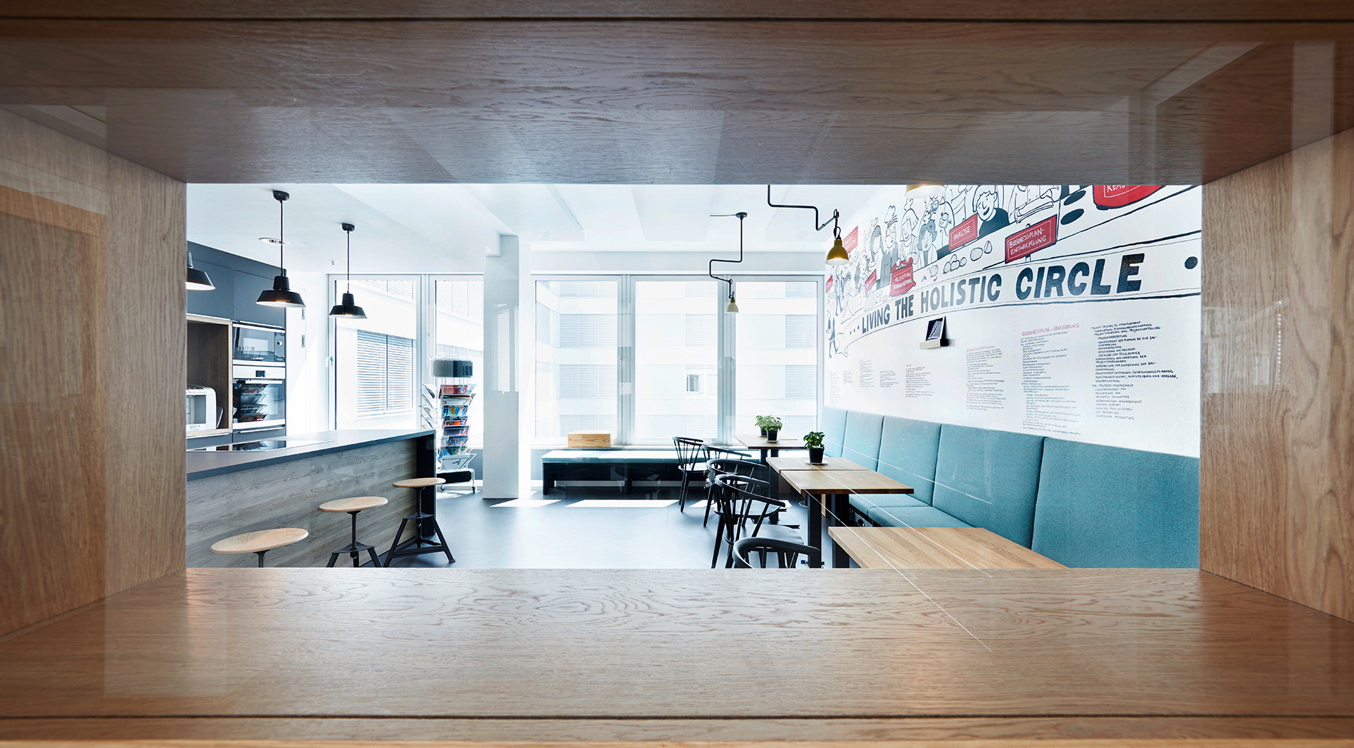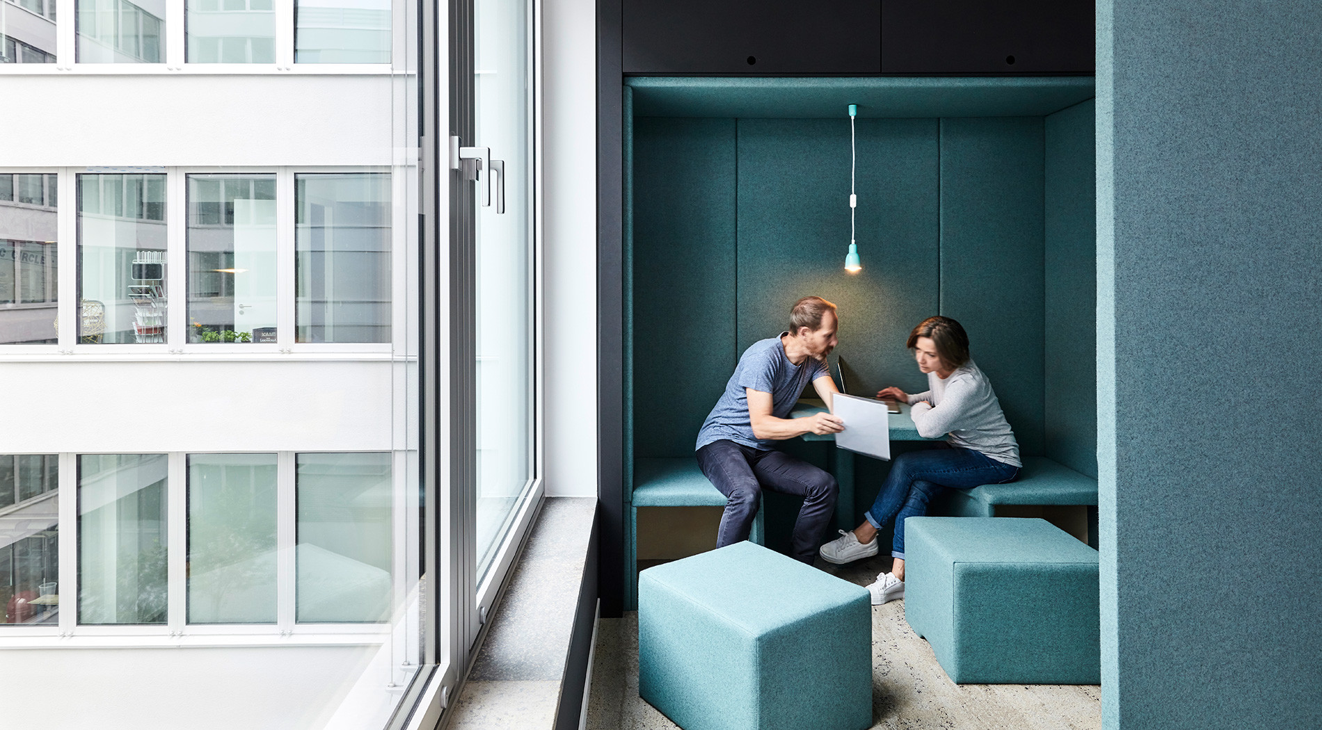 Die Open Spaces werden ergänzt durch maßangefertigte, farbige Stauraum- und Sitznischen als Kommunikations- und Rückzugsorte, zwei weitere Konferenzräume sowie vier Phone Booths. Eine akustisch wirksame Sitznische mit verstaubaren Sitzhockern, die sich hinter einer Klappwand verbirgt, dient als Raumerweiterung und bietet Platz für bis zu vier Personen.