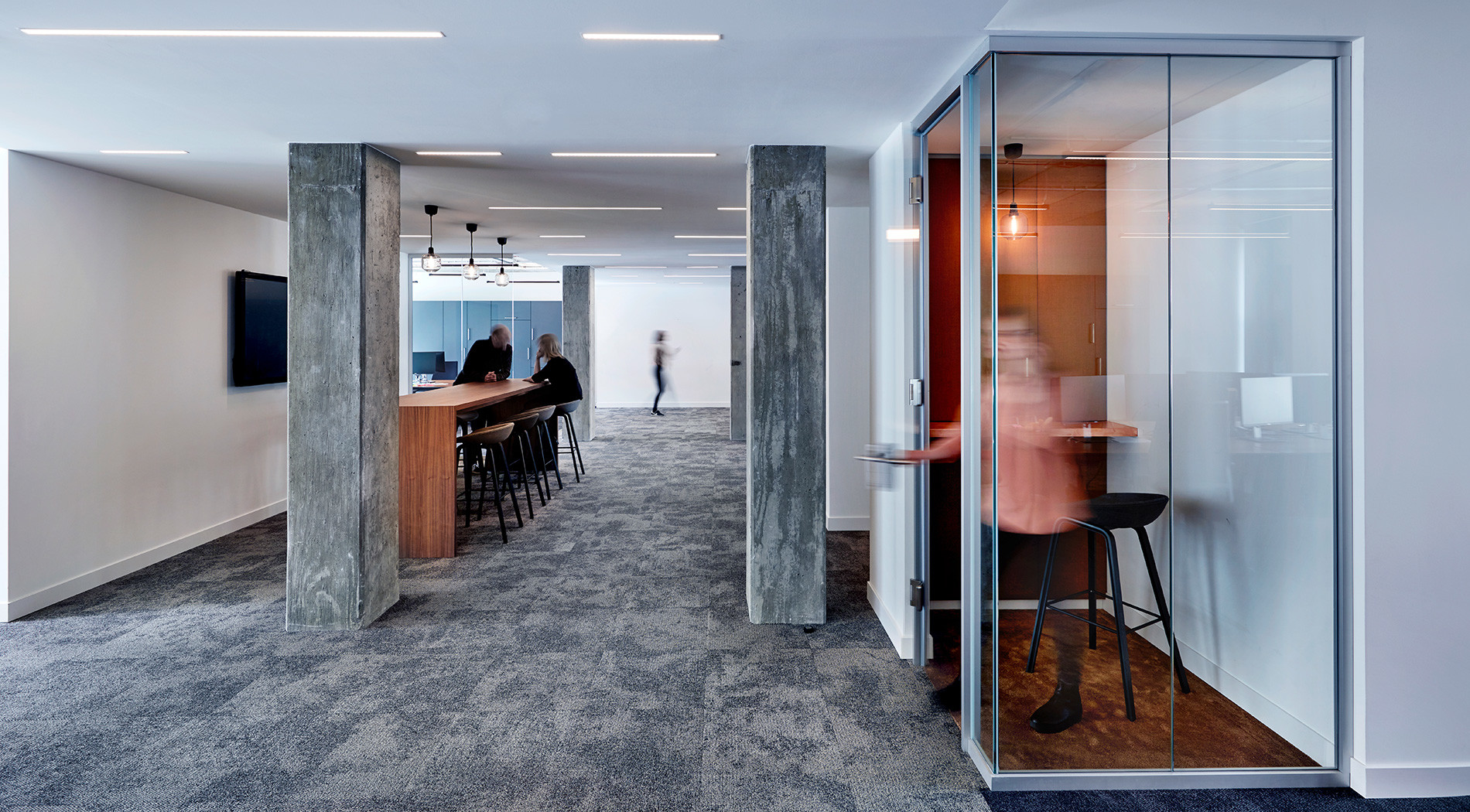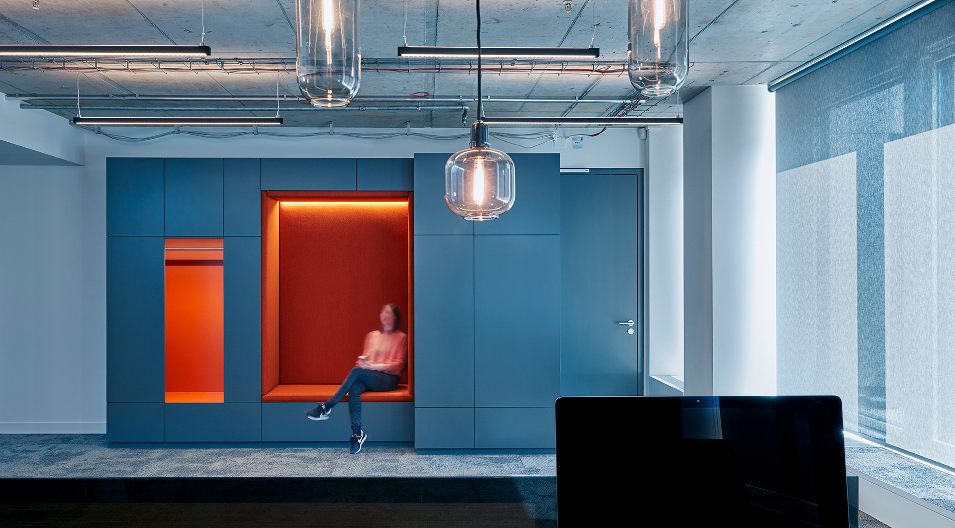 Die fünf Einzel- und Doppelbüros sind teils transparent an den Workspace angeschlossen, teils mittels neuer, zur Fassade hin orientierter Flure als ‚räumliche Filter’ erschlossen. Durch die Verwendung von Glaselementen und dem Prinzip sich immer wieder öffnender und schließender Bereiche wird transparentes Arbeiten bei gleichzeitiger Wahrung von Diskretion gewährleistet. Die großzügig gestalteten Verkehrsflächen bieten Raum für den Austausch der Mitarbeiter. So dienen die entlang der Flure positionierten ‚Quick Meets’ und gepolsterten Sitznischen als Rückzugsmöglichkeit oder Treffpunkt für kurze Gespräche.