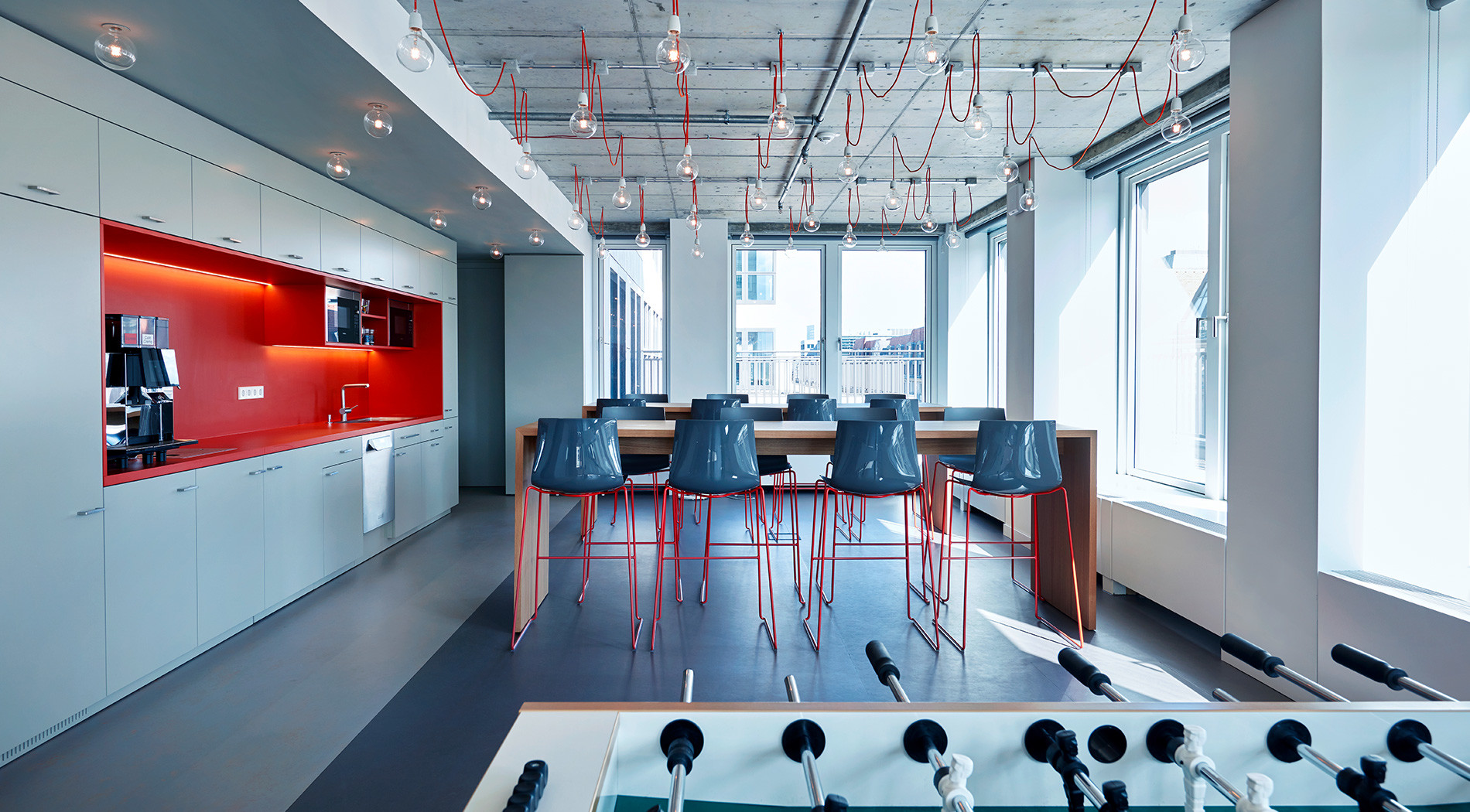 Die beiden Sondergemeinschaftsbereiche ‚Bistro’ und ‚Design Thinking’ bilden die Herzstücke des Büros. Sie wurden vom innenliegenden Kern zur Fassade hin orientiert und verfügen jeweils über eine Anbindung an eine eigene Terrasse als Teil der Common Zone. Beide Räume sind durch eine niedrige Deckenzone am Gebäudekern, die die Serviceeinheiten und Laufwege fasst, und einem raumgreifenden Beleuchtungskonzept aus rund 60 Pendelleuchten mit einfacher Porzellanfassung im 1x1 Meter-Raster gleich geprägt. Im ‚Design Thinking’ beherbergt ein 15 m langes maßgeschneidertes Einbaumöbel, das sich aus dem Warte- und Garderobenmöbel am Empfang entwickelt, neben der Bibliothek und dem Coffee-Point auch den Stauraum für die lose Möblierung. Das flexibel nutzbare ‚Design Thinking’ steht für Workshops, Brainstormings oder Präsentationen zur Verfügung, kann aber gleichzeitig von den Mitarbeitern zum Relaxen und Auftanken bei einem Tischtennismatch genutzt werden. Im gegenüberliegenden Bistro mit Lounge-Insel und Games-Area, das für gemeinschaftliches Essen ebenso wie für informelle Meetings genutzt wird, ist die Serviceküche mit dem Getränkelager in räumlicher Verlängerung zum Einbau des Design Thinking untergebracht.