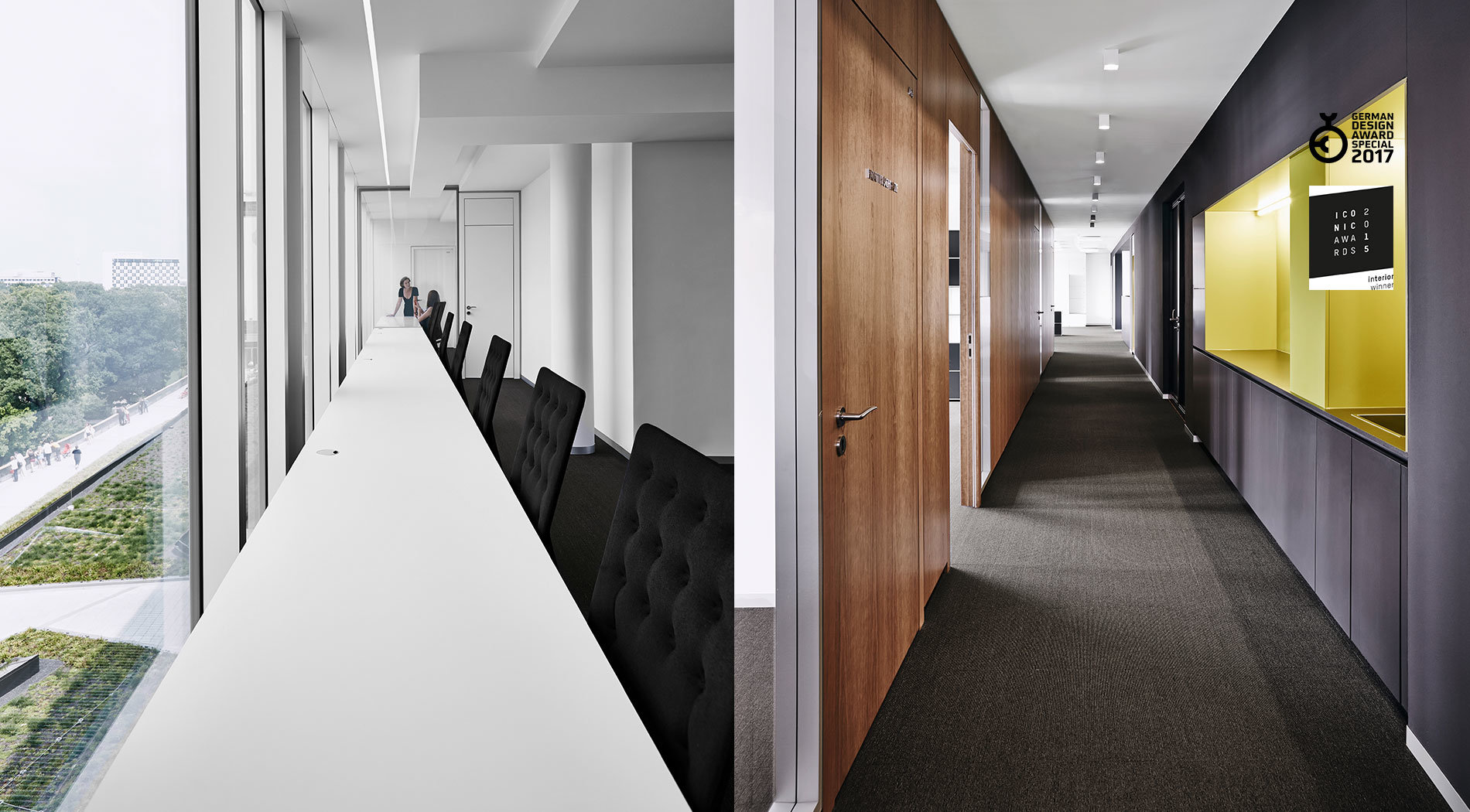 In particular, areas with very diverse workplaces were created alongside fixed work stations in response to the firm's day-to-day operation, with its predominantly flexible working hours. In addition to rather classical, functional individual offices and representative double and partner offices, there are spacious open areas, especially at the end of halls on office floors, with built-in, glass team rooms. In addition to alternating six and four seat benches, designs for both floors included telephone booths for private conversations, glass cubicles with individual workplaces and, along the outer wall and oriented toward the zoo, long tables to meet the temporary workplace needs of employees. The corridor widens in the middle zones and provides space for open desktops as well as lounge areas.