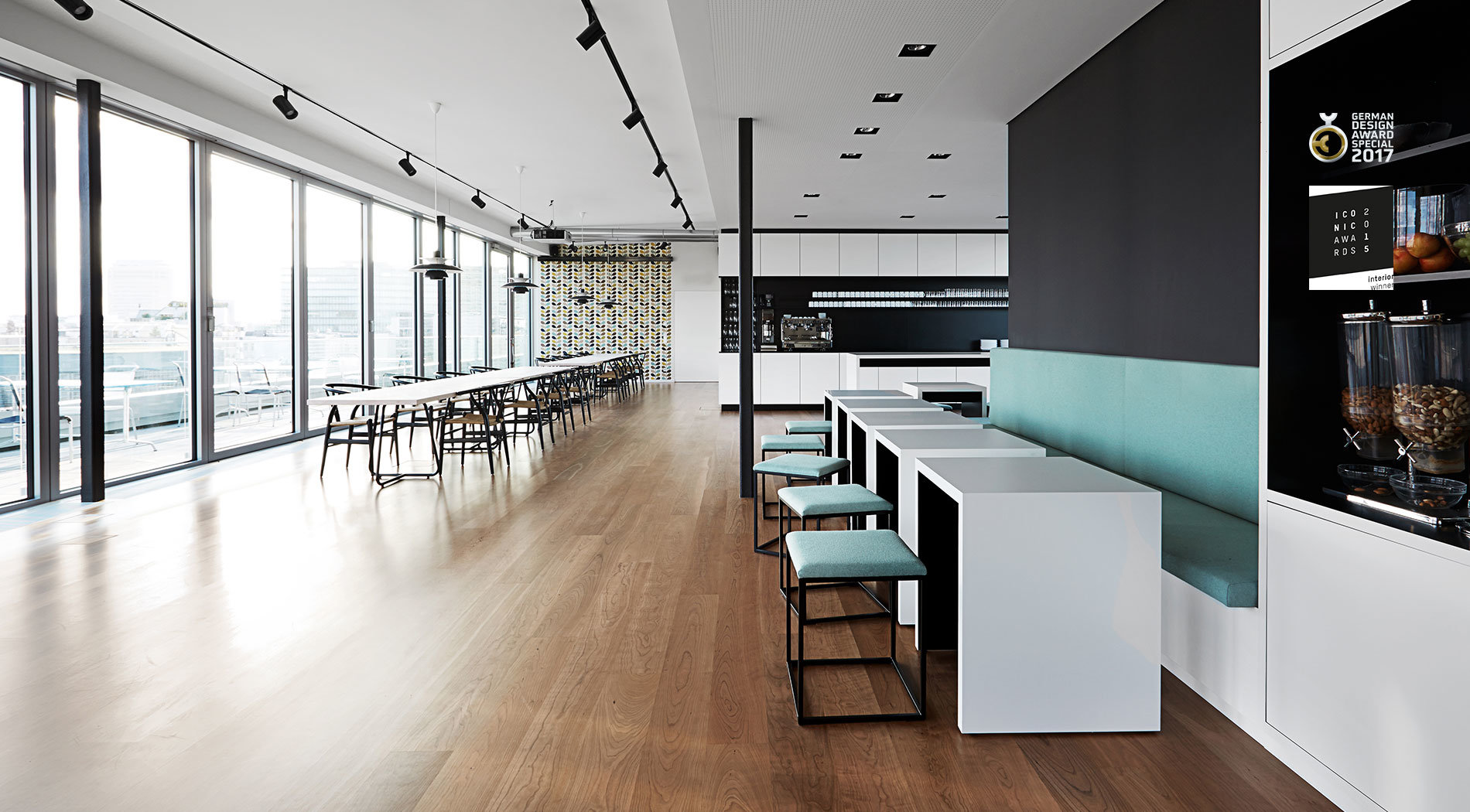 The office spaces for the consulting firm's 300 employees extend over three floors and offer views of the Kaiser Wilhelm Memorial Church and the lively City West shopping district on the street side. The rear provides a spectacular panoramic view of the Tiergarten, the BIKINI's freely accessible roof terrace and animal enclosures in the zoo.