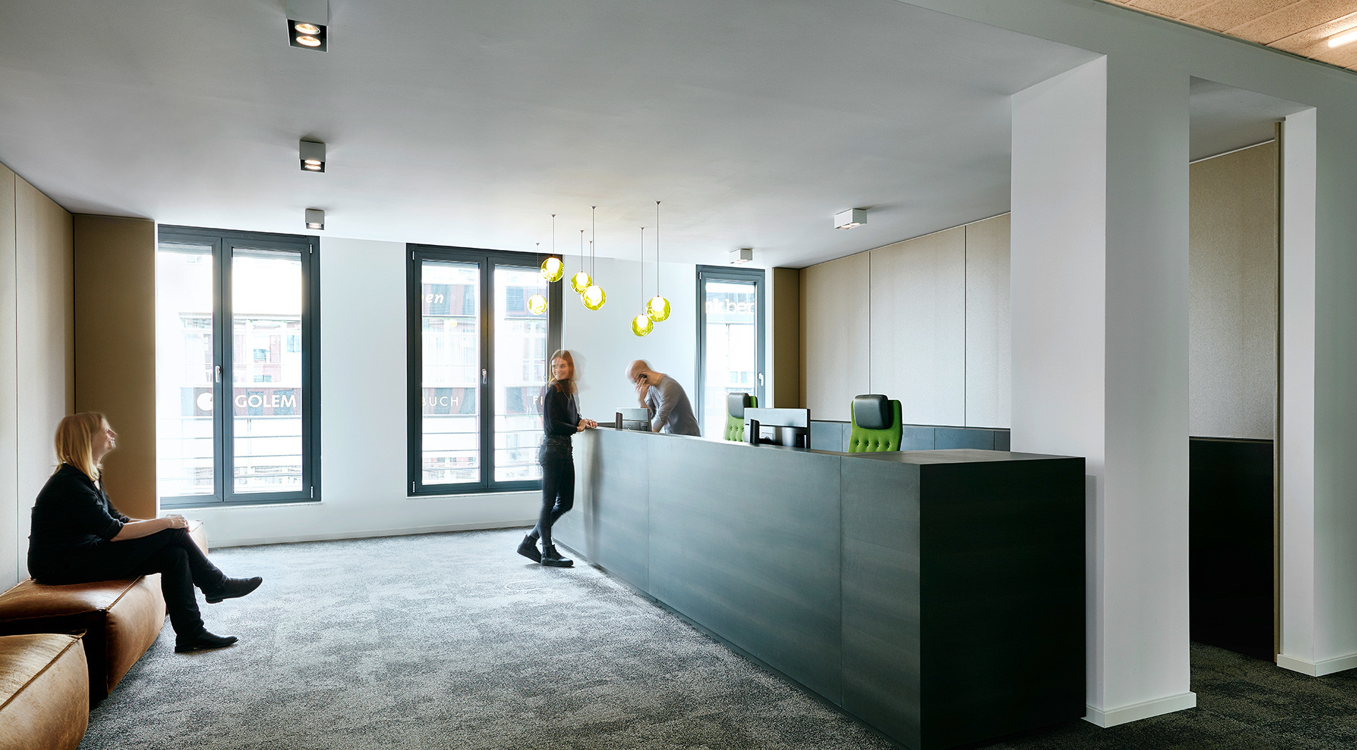 Der großzügige Empfang mit langem Tresen und Wartebereich formt sich aus zwei freien, sich gegenüber stehenden Wandscheiben. Der an den Empfang angeschlossene Workshopraum erhielt eine Deckenkonstruktion aus abgehängten schwarzen Akustikpaneelen mit freiem Blick auf die Rohdecke. Ein maßgefertigtes Einbaumöbel mit Regalfunktionen und integrierter Medientechnik hinter einer Schiebewand sowie ein Whiteboard ergänzen die Raumgestaltung.