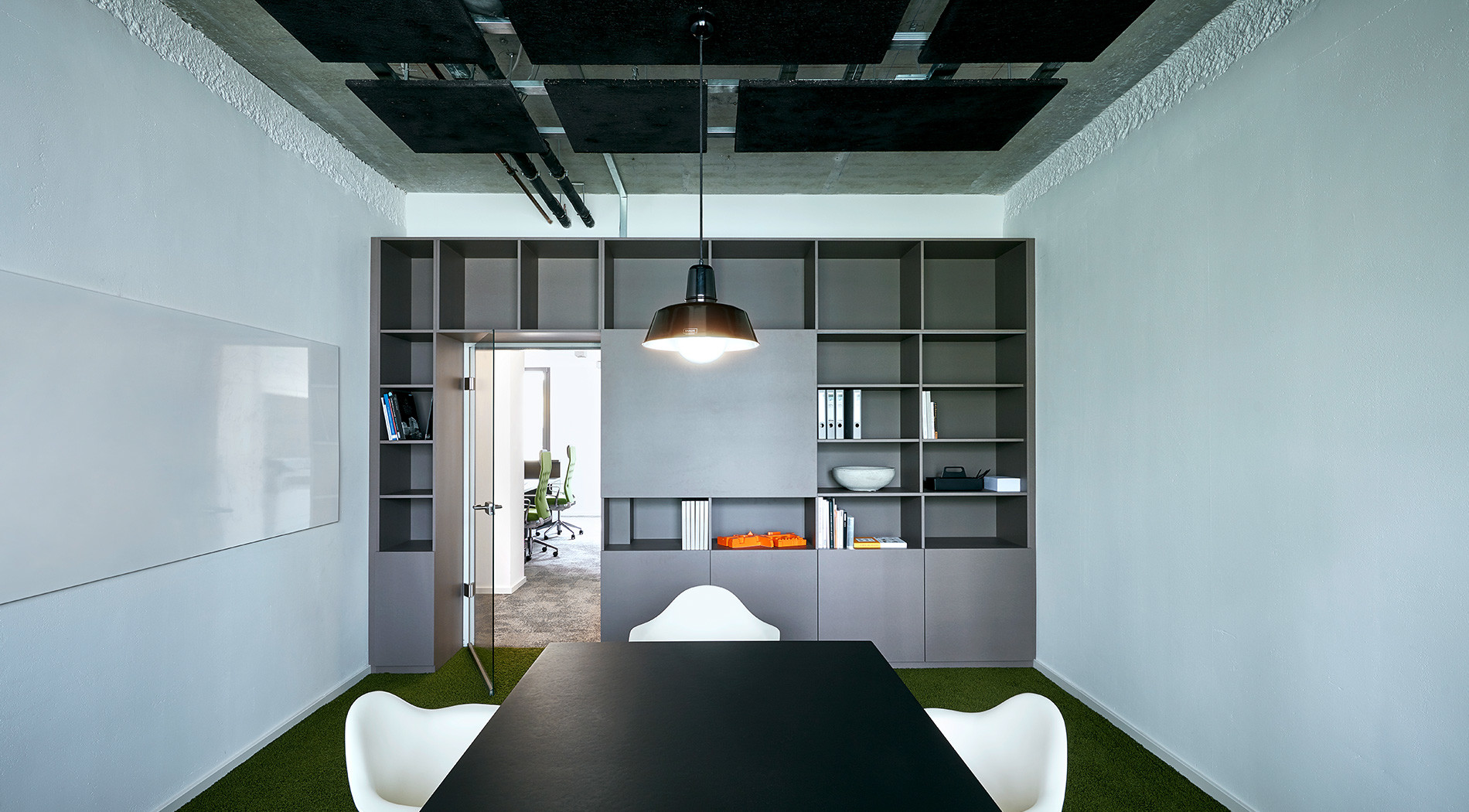The expansive reception space, with its long counter and waiting area, is shaped by two opposing, free-standing wall slabs. The ceiling design in the workshop room adjoining the reception space consists of suspended black acoustic panels, exposing the concrete slab above. A custom built-in wall unit with shelving, integrated media technology behind a sliding panel and a white board complete the interior design.