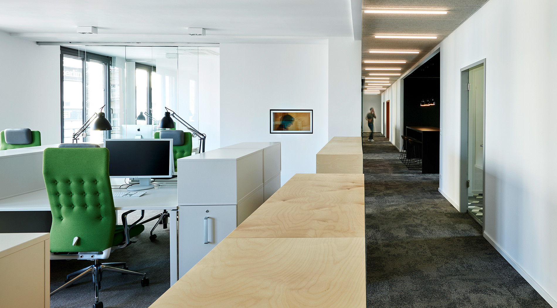 Das im Flur positionierte Quick Meet mit Stehtisch und schwarz gepolsterter Wandverkleidung dient als informelle Besprechungszone. Die quer zur Längsrichtung und zusätzlich im Versatz angeordneten Linienleuchten im Korridor brechen bewusst mit der langen Flucht-Perspektive und binden die danebengelegenen Bereiche ein. Zwei mit moderner Medientechnik ausgestattete Konferenzräume am Endes des Korridors bieten einen hochwertigen Blick auf die Umgebung des Hackeschen Marktes. Eine kleine Lounge zwischen den beiden Meetingräumen dient als Bibliotheksbereich und zum Relaxen.