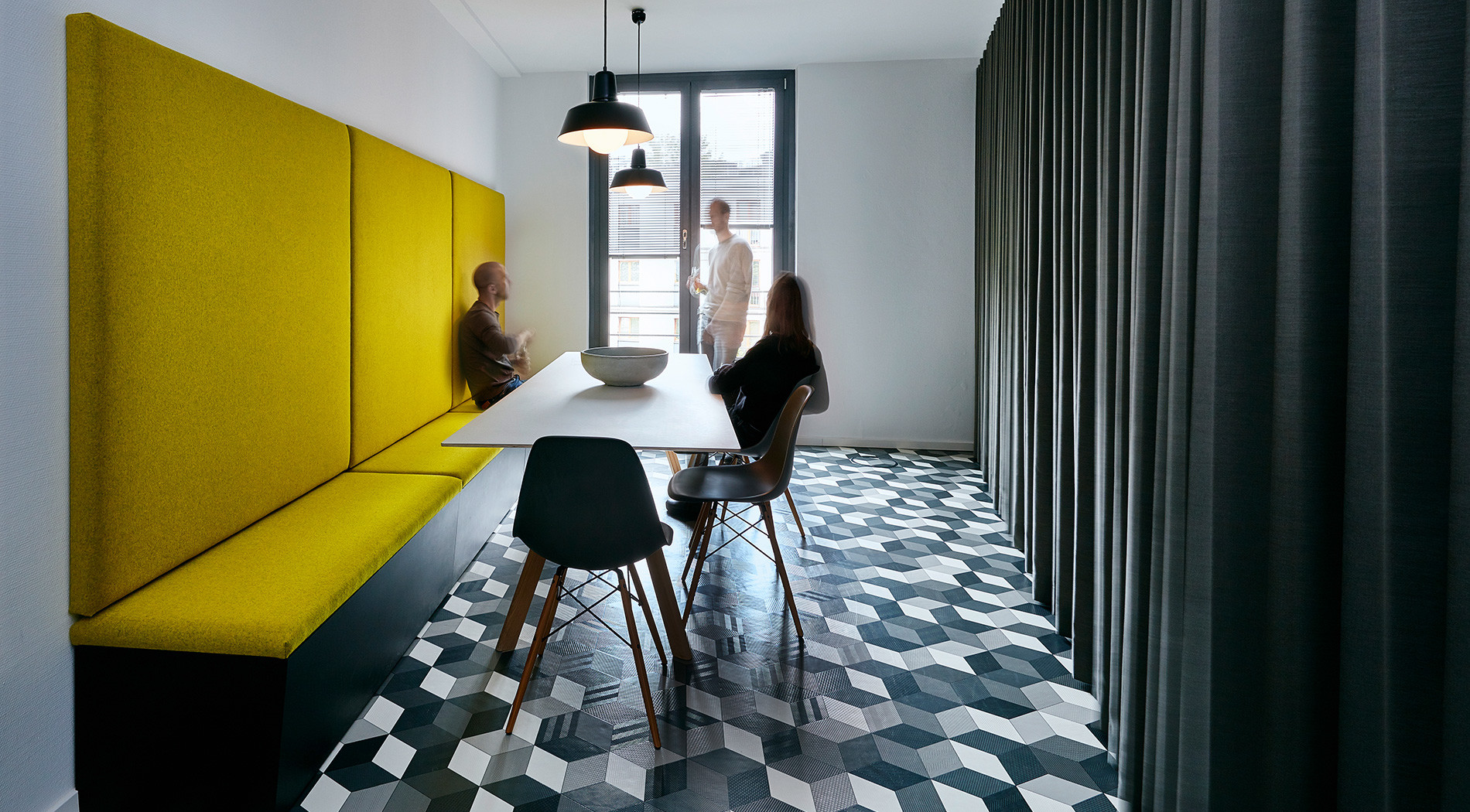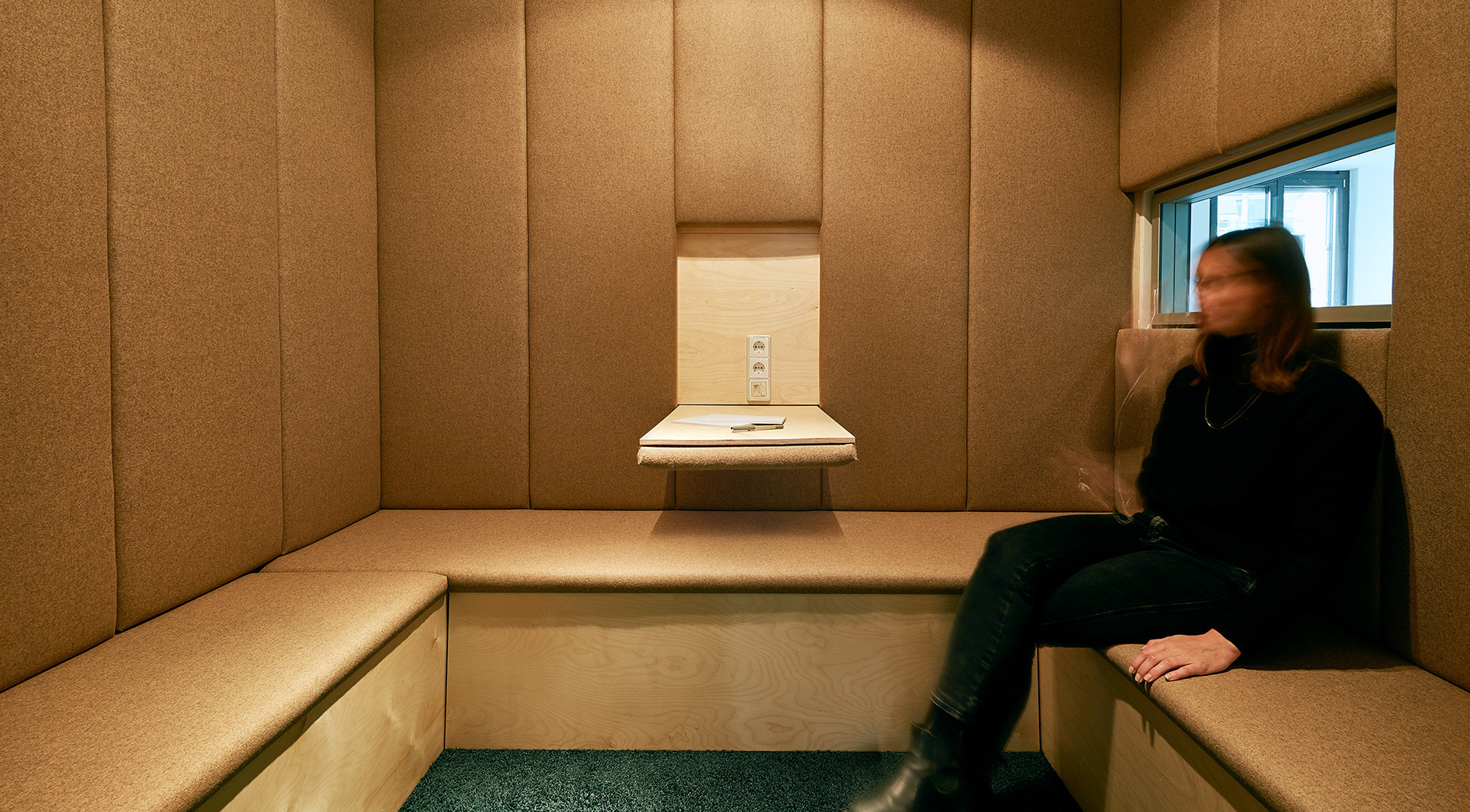 Both open spaces and the spatially connected quick meet were arranged along the Hackeschen Markt facade. They offer a work environment that ensures transparency and concentration in equal measure. The walls defining the space stand free of the facade, providing additional access alongside the floor-to-ceiling windows, emphasising the exclusive location of the office space. The open spaces are attached to an inset block that encompasses the functional phone booth and meeting box spaces as well as two team leader offices. Sliding glass panels allow the offices to be opened up, connecting the open spaces with each other. With their acoustically effective bench upholstery, sliding glass doors and window vistas, the phone booth and meeting box offer an opportunity for withdrawal and confidential conversations.