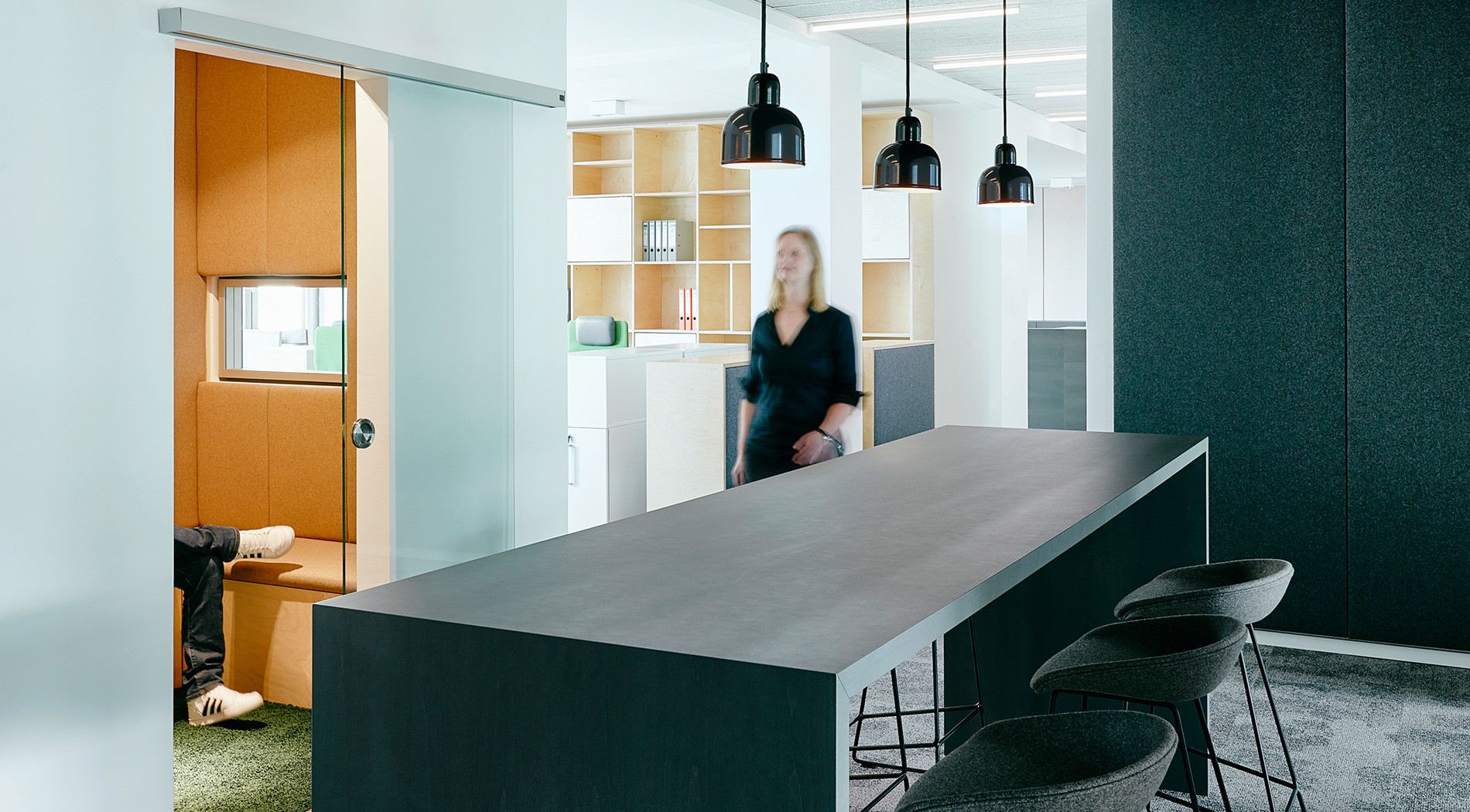Die beiden Open Spaces in räumlicher Verbindung zum Quick Meet wurden fassadenseitig zum Hackeschen Markt hin angeordnet. Sie bieten eine Arbeitsumgebung, die gleichermaßen Transparenz und Konzentration gewährleistet. Die raumbildenden Wände haben keinen Fassadenanschluss und bieten so eine zusätzliche Erschließung entlang der bodentiefen Fenster, was die exklusive Lage der Bürofläche betont. Die Open Spaces sind an einen eingestellten Block angegliedert, in dem die Funktionsräume Phone Booth, Meeting-Box sowie zwei Teamleiter-Büros zusammengefasst wurden. Über Glas-Schiebe-Elemente lassen sich die Büros großzügig öffnen und so die Open Spaces miteinander verbinden. Die Phone Booth sowie Meeting-Box mit akustisch wirksamer Sitzbankpolsterung, Glasschiebetüren und Fensterdurchblicken bieten die Möglichkeit für Rückzug und vertrauliche Gespräche.