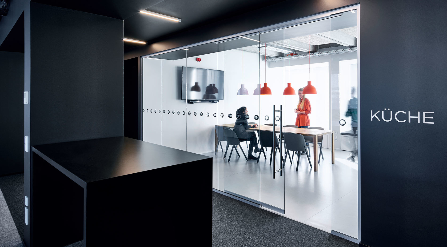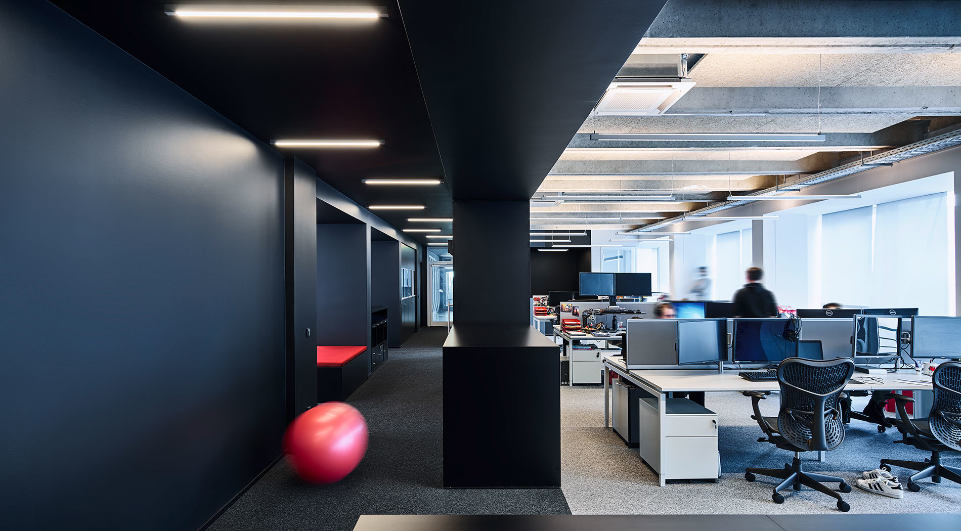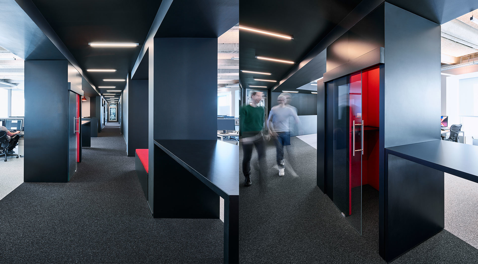 The new office area is graphically defined by a distinctive bright/dark contrast. The corridor, with its black finishes and suspended ceiling, form the spine that connects all of the office’s utilisation units. It serves as a walking zone while housing special functions such as the red-upholstered phone booths, informal meeting areas and the service point. Staggered linear lamps that make reference to the position of workplace lighting to the left and right emphasise the escape of the central zone.