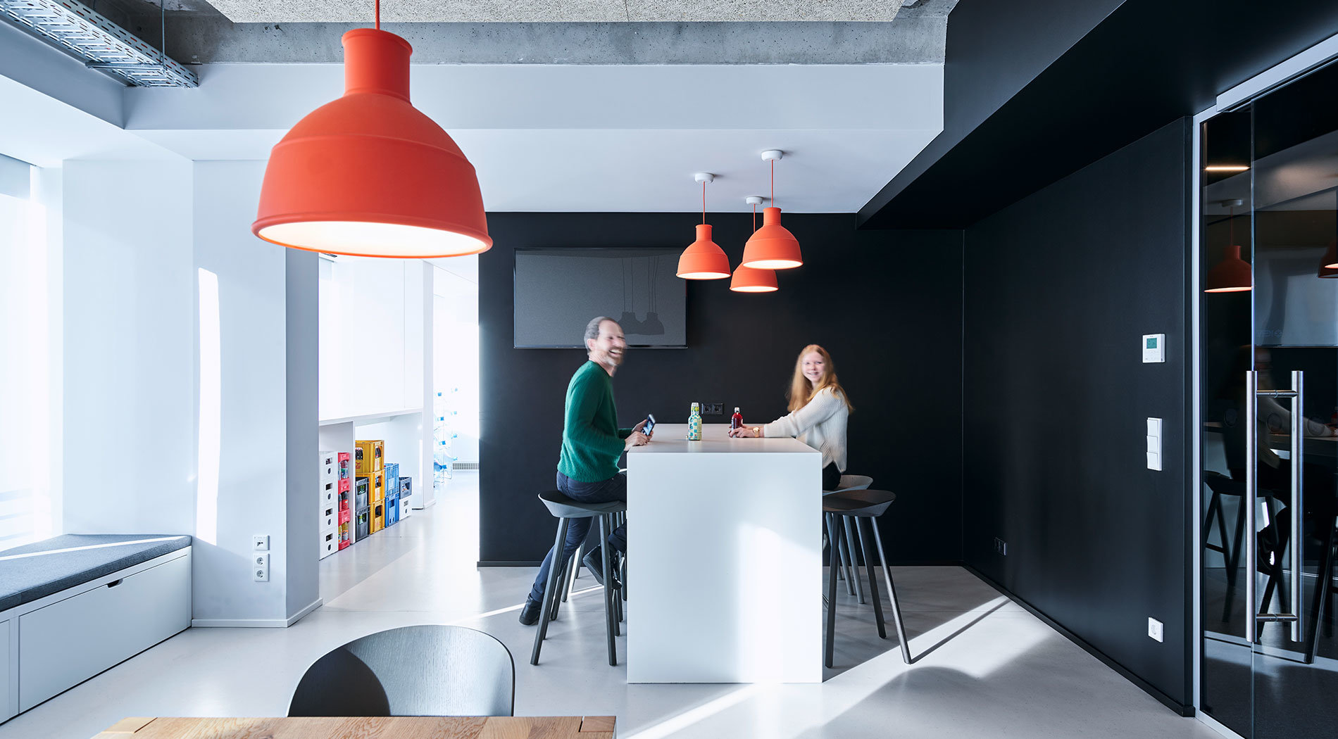 Die neue Bürofläche wird grafisch bestimmt durch einen markanten Hell-Dunkel-Kontrast. Der schwarz gefasste Korridor mit der abgehangenen Decke bildet das Rückgrat, das alle Nutzungseinheiten des Büros miteinander verbindet. Er dient als Laufzone und beherbergt gleichzeitig die Sonderfunktionen, wie die rot gepolsterten phone booths, informelle Meetingbereiche sowie den Servicepoint. Versetzt angeordnete Linienleuchten, die Bezug nehmen auf die Lage der links- und rechtsseitigen Arbeitsplatzbeleuchtung, verstärken die Flucht der Mittelzone.