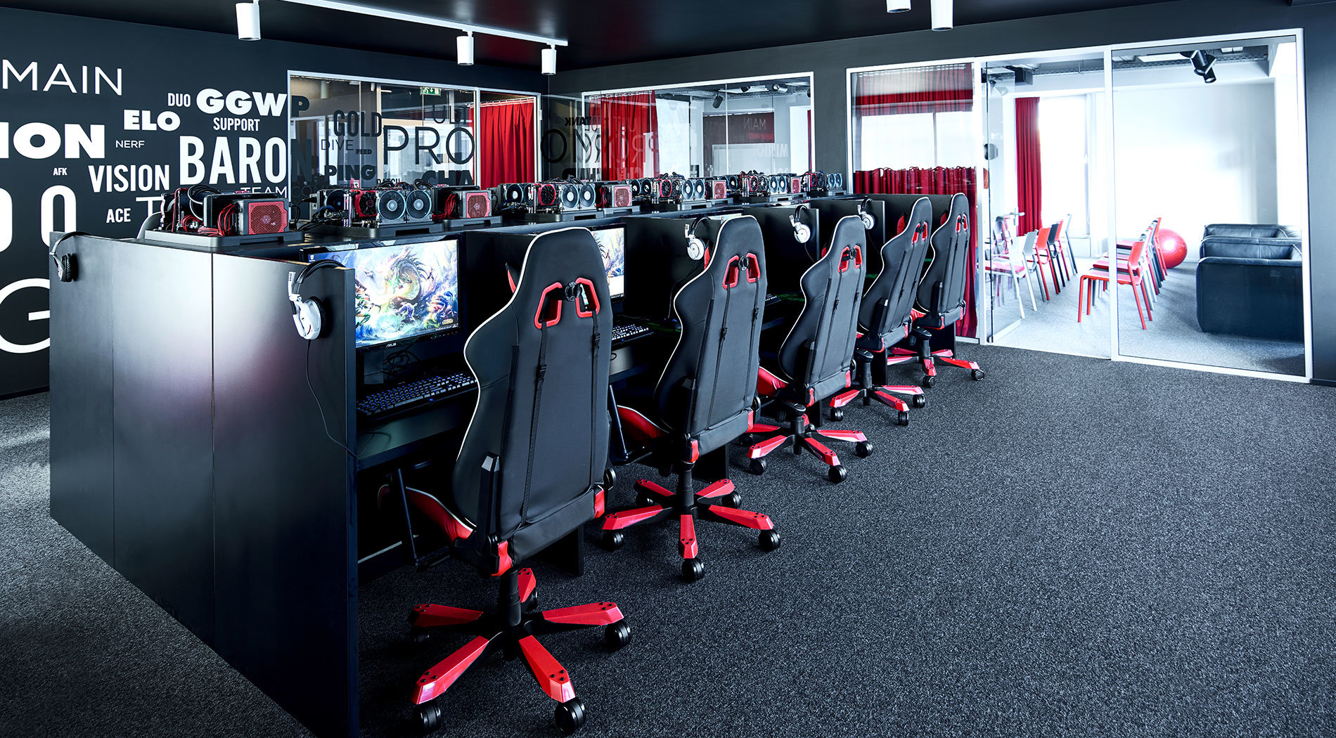 Eine räumlich zusammenhängende Einheit bilden die Players-Lounge und das Auditorium. Dieser Bereich wurde durch eine Glaswand mit schwerem Vorhang so gestaltet, dass beide Räume getrennt voneinander nutzbar sind, bei Bedarf aber auch ein visueller Austausch möglich ist. Die Players- Lounge mit den Computerkabinen bietet Platz für zwei Teams, die hier virtuell auf der ‚Map’ gegeneinander antreten können. Das angrenzende Auditorium dient als Workshop-Raum und erlaubt dank der Ausstattung mit einem Multimediasystem, einer Reihenbestuhlung und Loungemöbeln unterschiedliche Nutzungsarten.