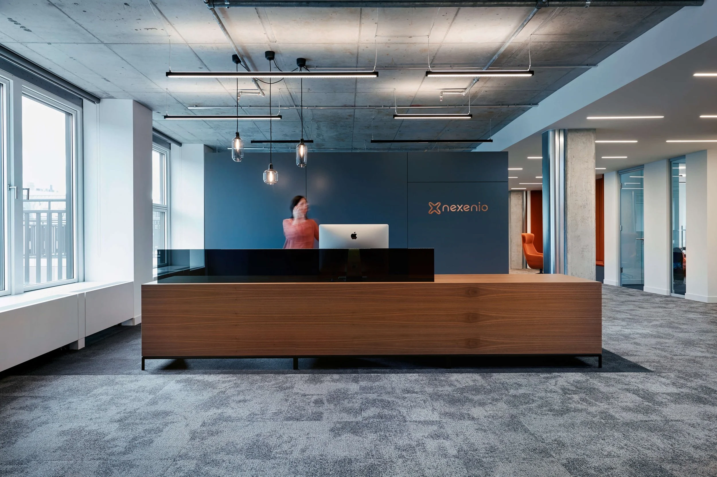 Für das Softwareunternehmen neXenio entstand im Berliner „The Q“ ein offenes Bürokonzept auf mit fließenden Raumstrukturen, offenen Workbenches, fokussierten Rückzugsorten und Meetingzonen. Zwei zentrale Räume – Design Thinking und Bistro – bilden das kommunikative Herzstück: mit Anschluss an die Terrasse, flexibler Möblierung und Funktionen von Workshop bis Games-Area. Farblich reduziert, mit prägnanten CI-Akzenten sowie zoniert über Licht und Boden, entsteht ein dynamischer Raum für kreative Prozesse – eine neutrale Plattform, die erst durch ihre Nutzer:innen bespielt und für das nächste Level angepasst wird.
