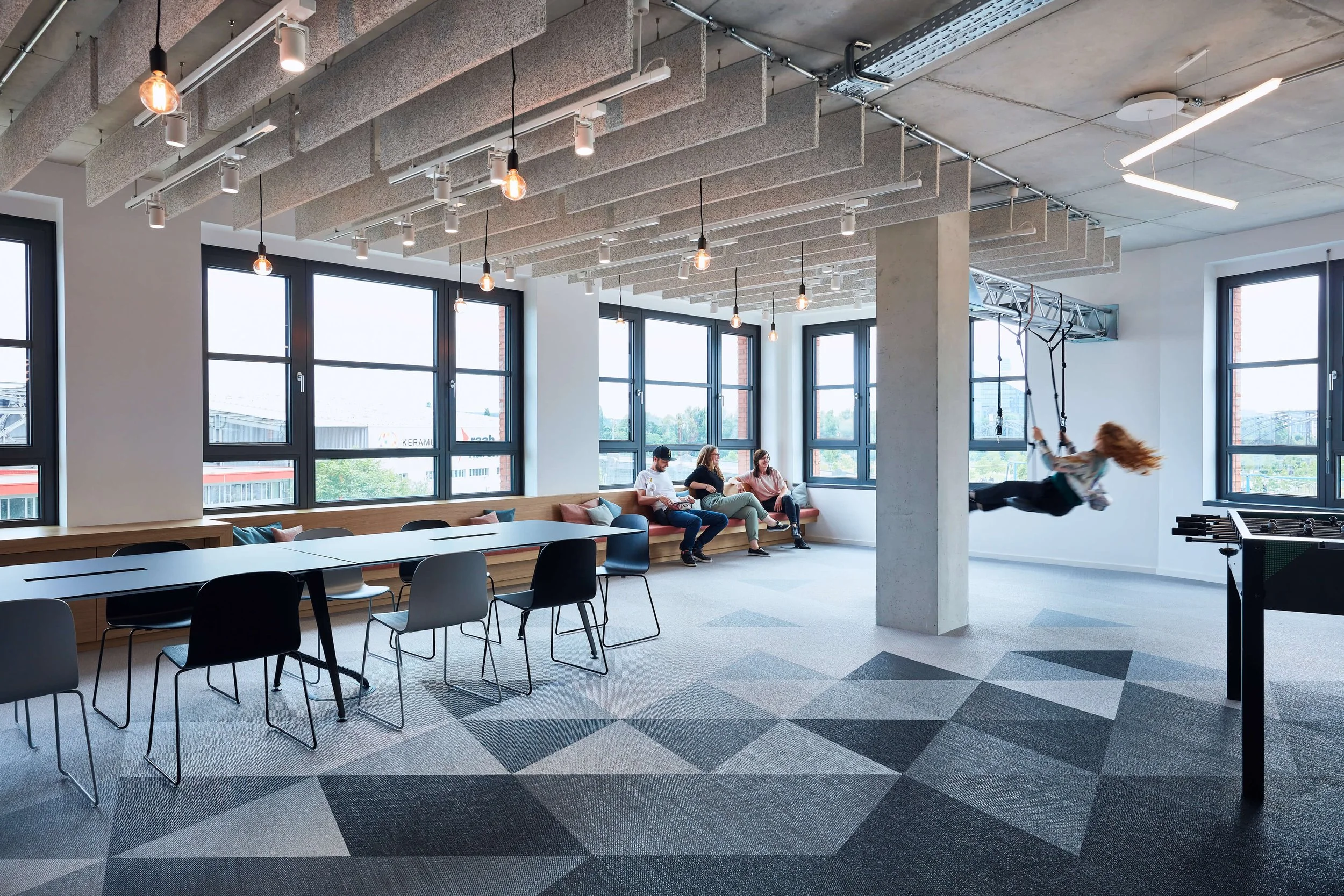 Für die Kommunikationsagentur SinnerSchrader entstand in Frankfurt ein workflowbasiertes Bürokonzept – mit flexiblen Teamzonen, Open Spaces, Küche und Meetingboxen. Herzstück ist die Arena im Eingangsbereich: als Coffee-Point, Ort für interne Events oder Videokonferenzen mit anderen Standorten. Eine klare Zonierung gliedert die Fläche entlang einer Mittelachse – mit maßgefertigten Fassadentischen, Glasboxen und ruhigen Arbeitsplätzen. Schwarze Akustikmodule, warme Holzdetails und gezielte Farbakzente schaffen eine Atmosphäre im Flow zwischen Konzentration, Kommunikation und Kollaboration.