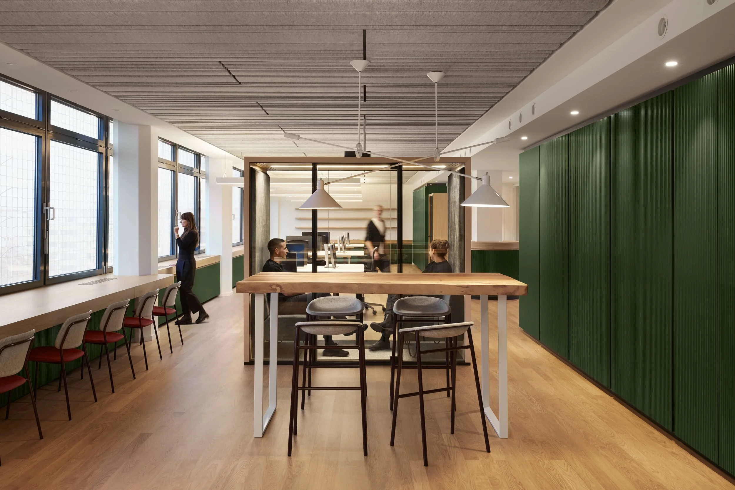 Ein Co-Working-Space als architektonisches Update. Am Berliner Kurfürstendamm haben wir für Juris einen eleganten Workspace im Altbau realisiert. Auf 260 m² entstand eine Arbeitswelt, die das Desk-Sharing-Prinzip nicht nur organisatorisch, sondern atmosphärisch und beziehungsfördernd interpretiert. Die Raumstruktur ist dabei fein differenziert. Open Spaces, Fokuszonen, Teamküche und Konferenzraum teilen sich die Fläche und greifen fließend ineinander: Durch Sichtachsen, durchgesteckte Grundrisse und zonierte Funktionen entstehen Raumbeziehungen und Identitätsanker. Die samtige, grün-rote Farbwelt zitiert die neue Markenidentität, eingebettet in einen Kontext aus Altbaucharme, Holz, Corian und akustisch wirksamen Texturen. Eine Einladung zum achtsamen Teilen.