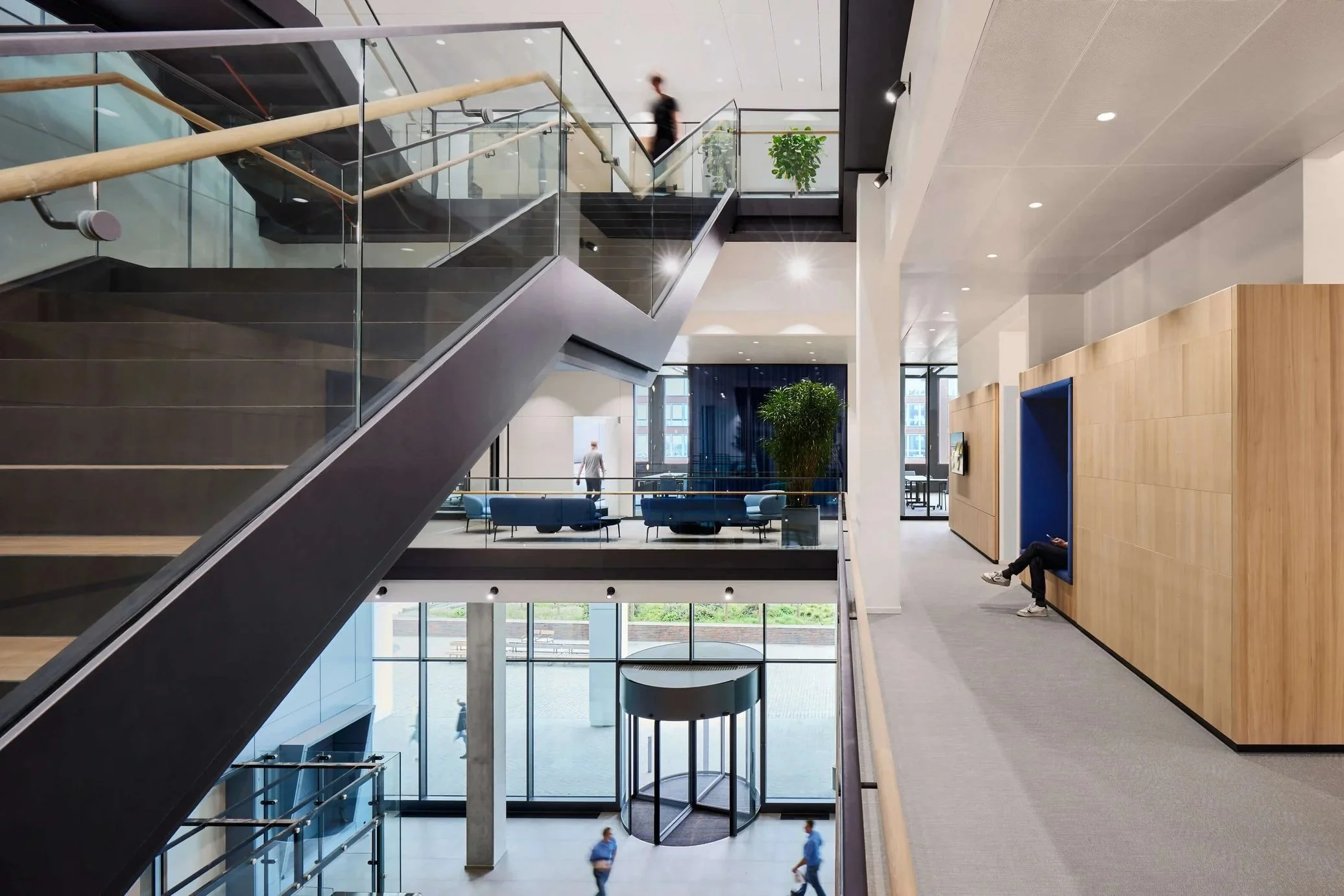 Das Arbeitsplatzkonzept folgt dabei keinem starren Raster. Sichtachsen und Blickbeziehungen sind bewusst und vielschichtig angelegt. Sie schaffen visuelle Verbindungen, die ihrerseits wiederum Interaktion, Austausch und räumliche Nähe fördern. So entstand ein zirkulierendes, organisch verwobenes Beziehungsnetz mit dem Charakter eines Dorfes in der Stadt.