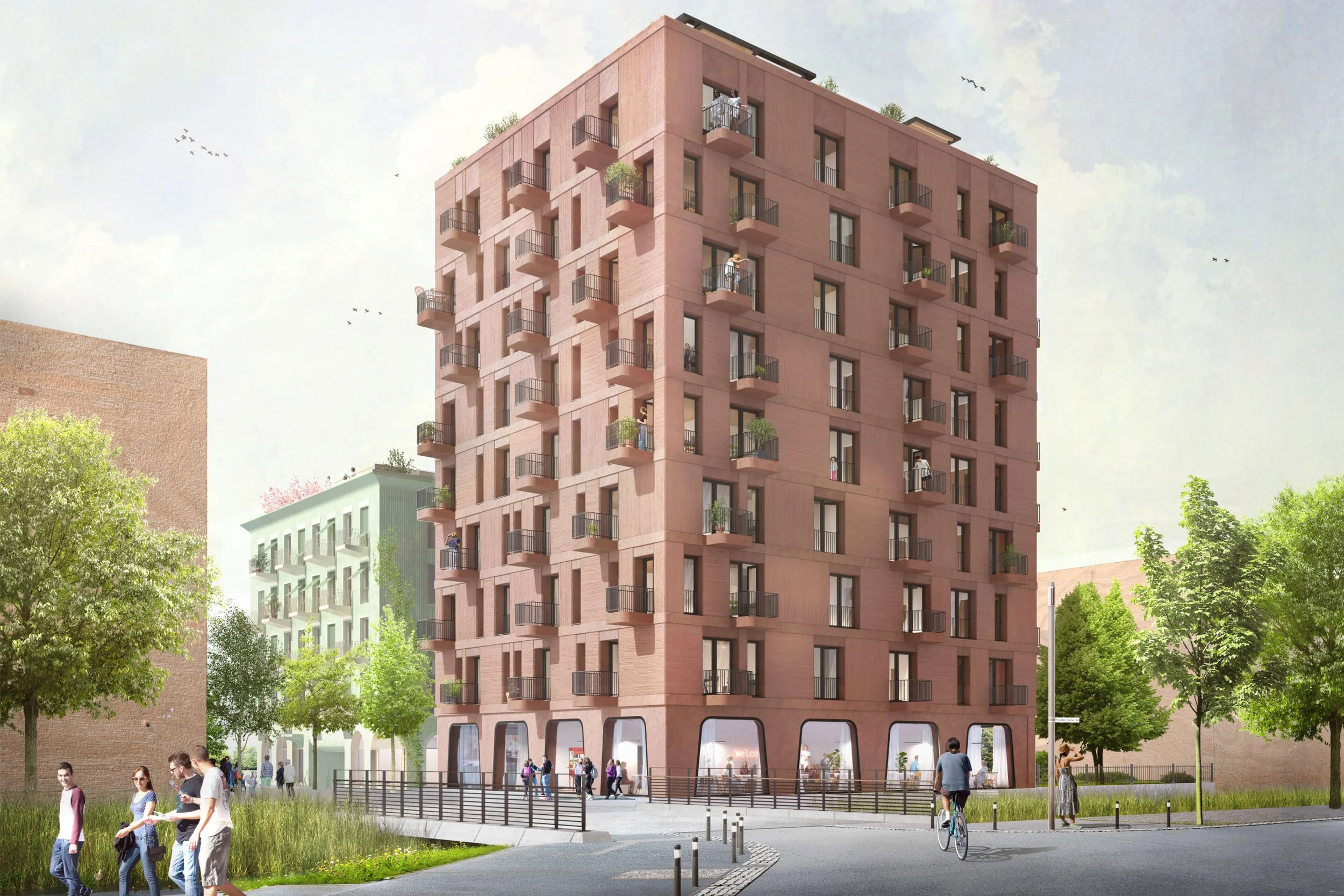 Die robuste Ziegel-Holz-Hybridkonstruktion mit Recyclingbeton im Kern und reduzierter Gebäudetechnik folgt einem einfachen Prinzip: langlebig bauen, Ressourcen schonen, Technik minimieren. Tiefe Laibungen, mineralischer Putz und plastisch hervortretende Balkone verleihen der Fassade Präsenz – entwickelt aus dem konstruktiven System, nicht aus der Geste.
